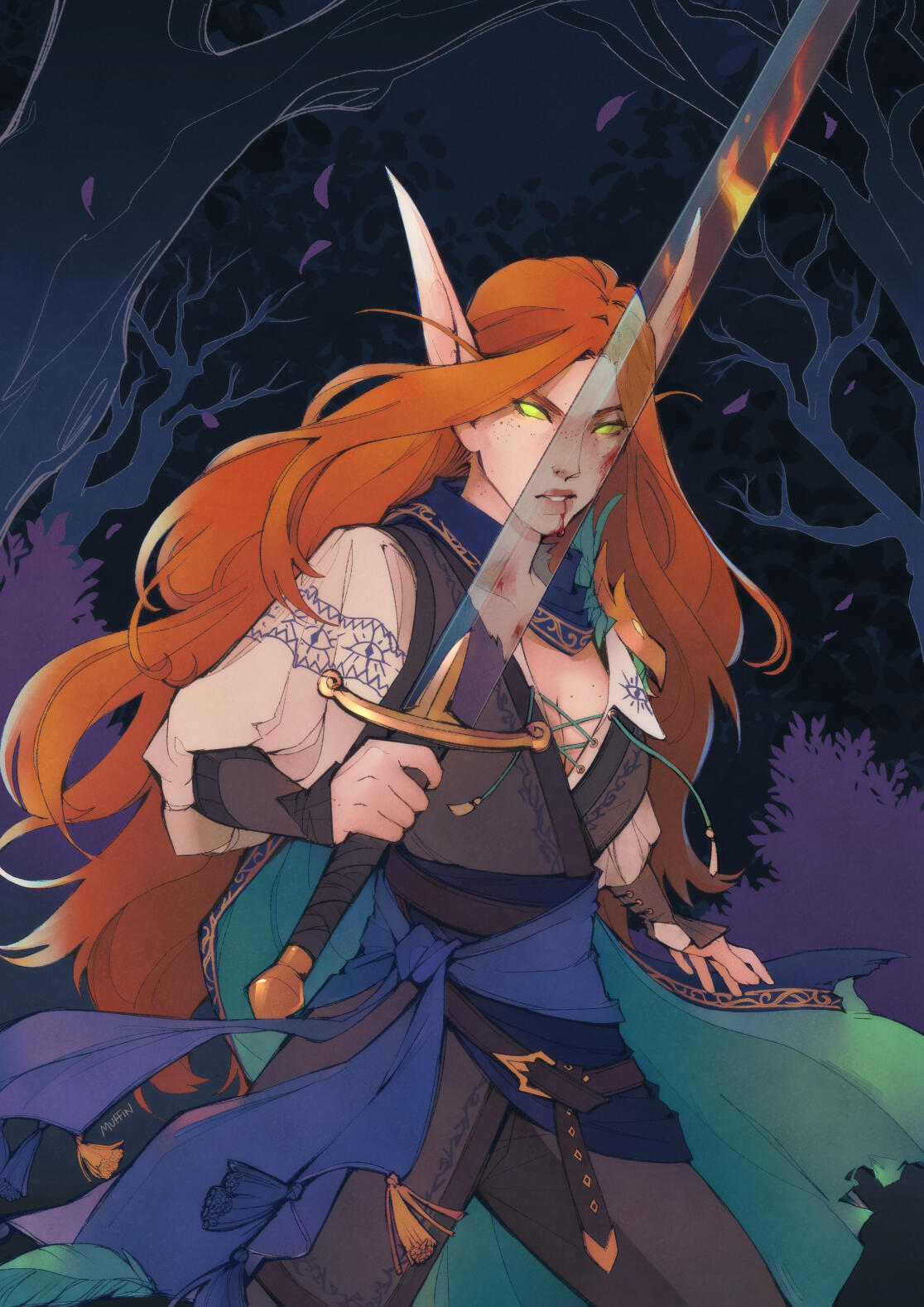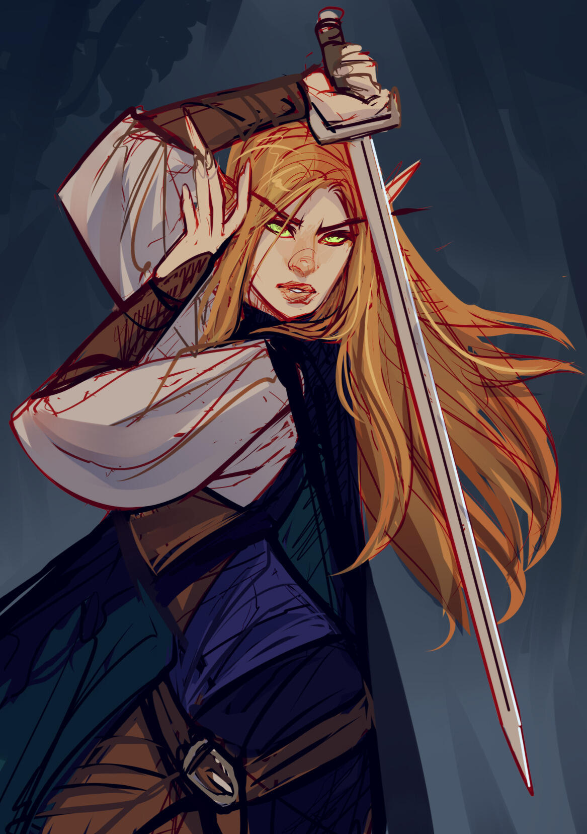 With a harsh disposition and a fierce ability to survive, Esme has a tongue as sharp and quick as her blades. Forged in a world of piracy, she eventually escaped that life and ran to Silvermoon City with the idea of posing as nobility to slip into a society she believed she deserved.The plan fell through after joining a private militia, in which she was punished and absolved for her crimes of falsifying nobility and her past in piracy. With newfound legal innocence, she made a name for herself within the militia and Quel'thalas as a whole. She became the Fleet Commander of the militia and she was given a letter of marque by the Thalassian government, naming her a privateer.While the militia has since dissolved, she maintains her position as privateer, and her reputation is well-known because of it. She has been named Knight-Captain of the land known as Embertree, and she continues her work at sea, her life's goal: hunting and ridding Azeroth of pirates.